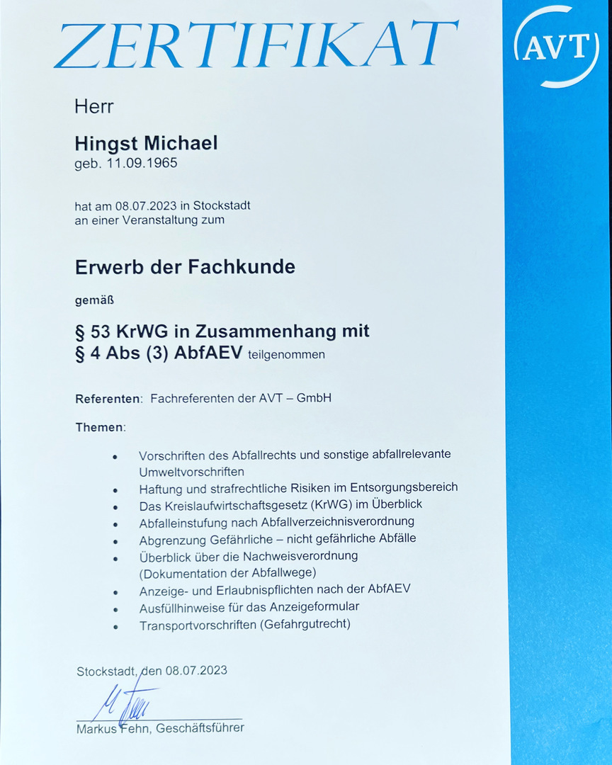 Kraftfahrzeuge, Anhänger und Wasserfahrzeuge in allen Größen. Wir sind im Besitz der nötigen Fachkunde §53 KrWG und der Sanierung von Asbest TRGS 519 und künstlicher Mineralwolle TRGS 521. Bei Michel